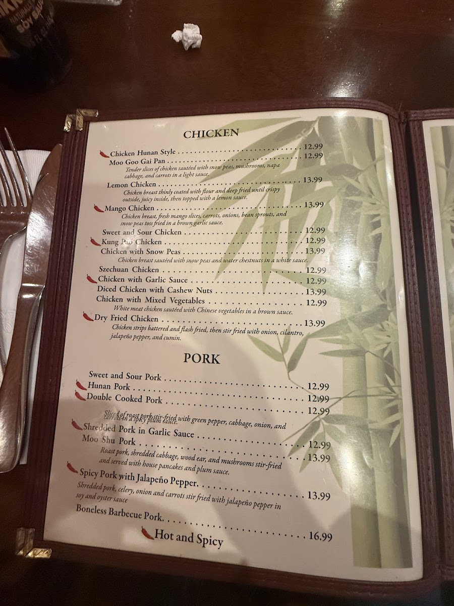 Hot! Sliced chicken breast meat sauteed with broccoli. Bamboo shoots and mushroom in a spicy. Peppery sauce