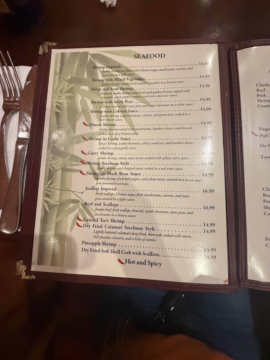 Hot Jumbo shrimp and fresh sea scallops sauteed with water cestnuts, celery wood ear and mushroom in spicy garlic sauce